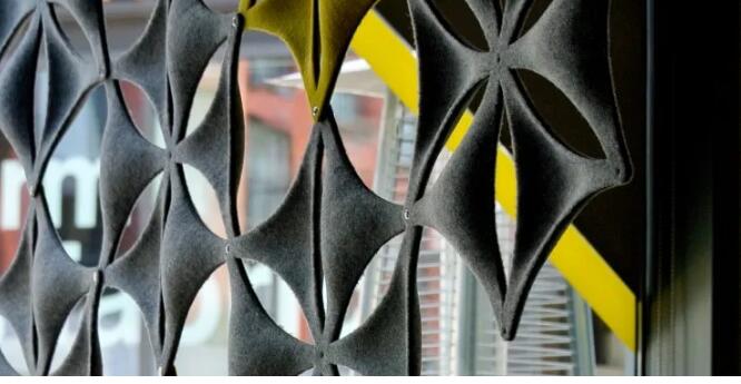 在室內(nèi)聲學(xué)設(shè)計(jì)中,無(wú)紡布越來(lái)越多地被用作可消音的“設(shè)計(jì)元素”。例如裝在墻面和/或頂棚上的單塊鑲嵌板、整面的墻面裝飾和吊頂、開(kāi)放式辦公區(qū)域用的消音隔板,或者用毛氈制造的整件家具。